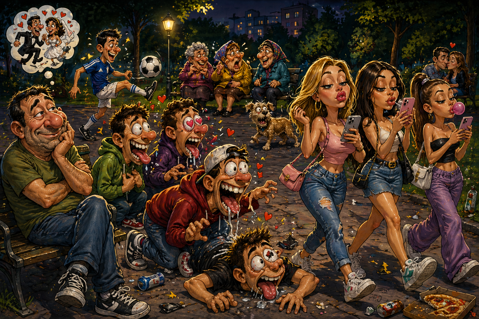 Vă jur că am petrecut în parcul ăla sute, mii de ore, de seara până noaptea, supraveghindu-mi copilul în timp ce alerga ca descreieratul peste tot. Și, tot alergând după el, în toate cotloanele posibile și imposibile, nu ai cum să nu observi tipologia celor care pun stăpânire pe acele bănci: babe ce povestesc una alteia rețete de ciorbă de pește, musaca sau cozonaci (o rețetă chiar am rugat pe una să mi-o dicteze, că prea părea interesantă), mămici cu cărucioare, uitându-se nervoase după tătici (naiba i-a pus pe ăștia să facă o terasă exact lângă parc), vreo duduie trecută de 40 care așteaptă… (Dumnezeu știe ce!), o grămadă de oameni ce scot cățeii la plimbare (e imposibil să nu calci în vreun rahat de câine cu ochii după odraslă), orice… mai puțin adolescenți îndrăgostiți, din ăia care stăteau pe bancă de parcă descoperiseră America doar pentru că li se atinseseră genunchii.